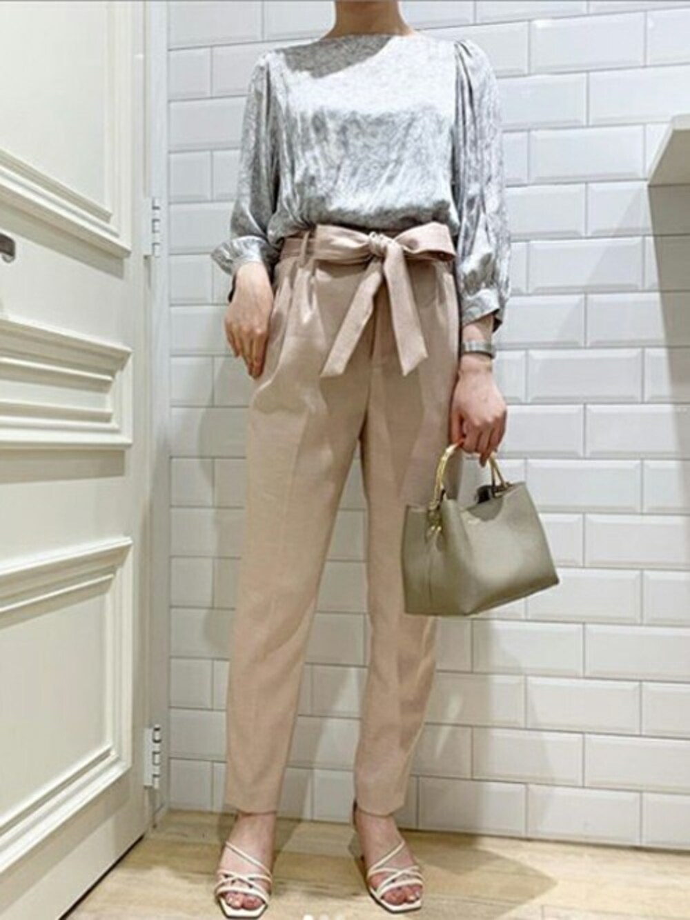 繊細な線画のボタニカルプリントブラウスに、柔らかなピンクのパンツを合わせました。 麻のような表面の風合いが大人っぽいパンツはひざ下はすっきりさせつつも程よくゆとりのあるシルエットで着まわしもしやすいです。