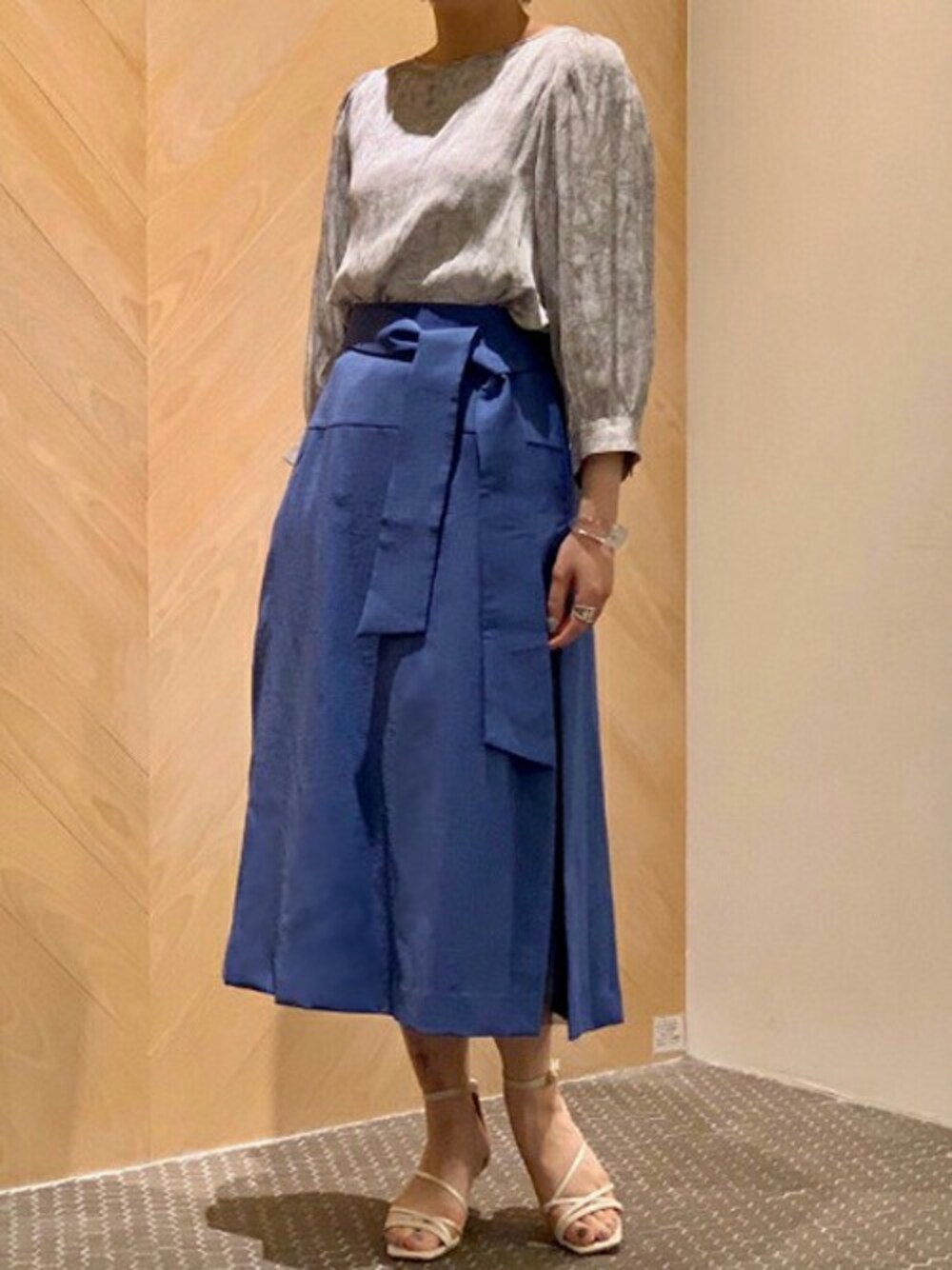 一見、かっちりとしたリボン付き台形スカートに見えますが、両サイドに深スリットが入っており、動きに合わせて中のチュールが覗く、技ありスカートです。 トップスには繊細な線画プリントの清楚な七分袖ブラウスを合わせました。