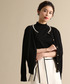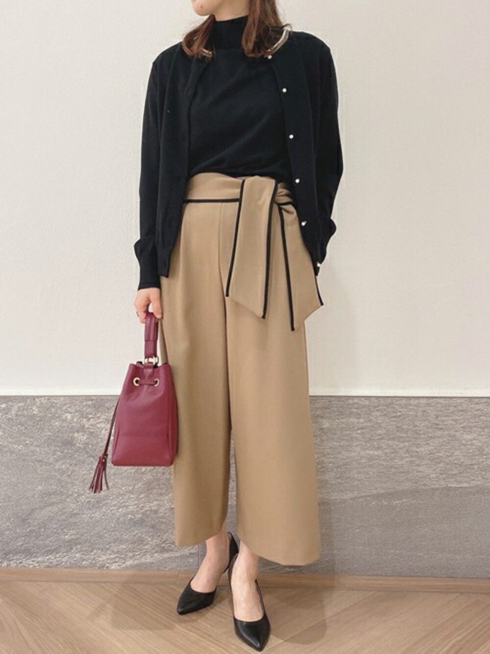 パールネックのカーディガンが上品なアンサンブルは、インナーが半袖のハイネックニットで、これから時期にぴったり。 秋らしいカラーのキャメルに合わせて品の良いスタイル。 オンオフに使えるコーディネートです。