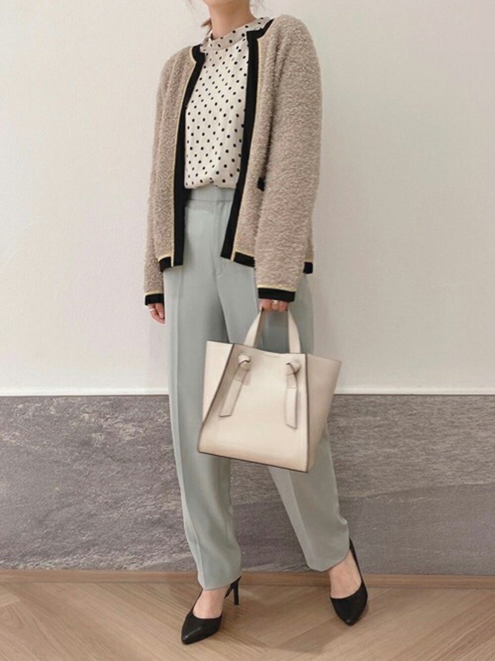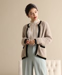 肌触りの良いニットジャケットはさりげないゴールドラインが華やかさをプラス。 ドットブラウスにはきれい色のパンツを合わせて。