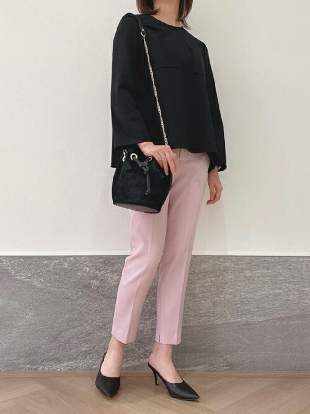 ブラックのトップスはインしなくてもキレイに着られる丈感がポイント! 細身のカラーパンツに合わせても、ヒップ周りをカバーしてくれます。