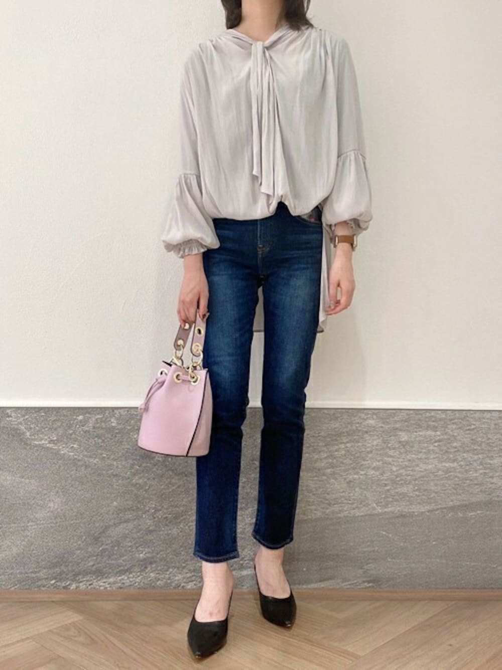 デニム×ボウタイブラウスで大人カジュアルスタイル。 袖口にはゴムが入っていて、腕まくりをしてもキレイなシルエットに。