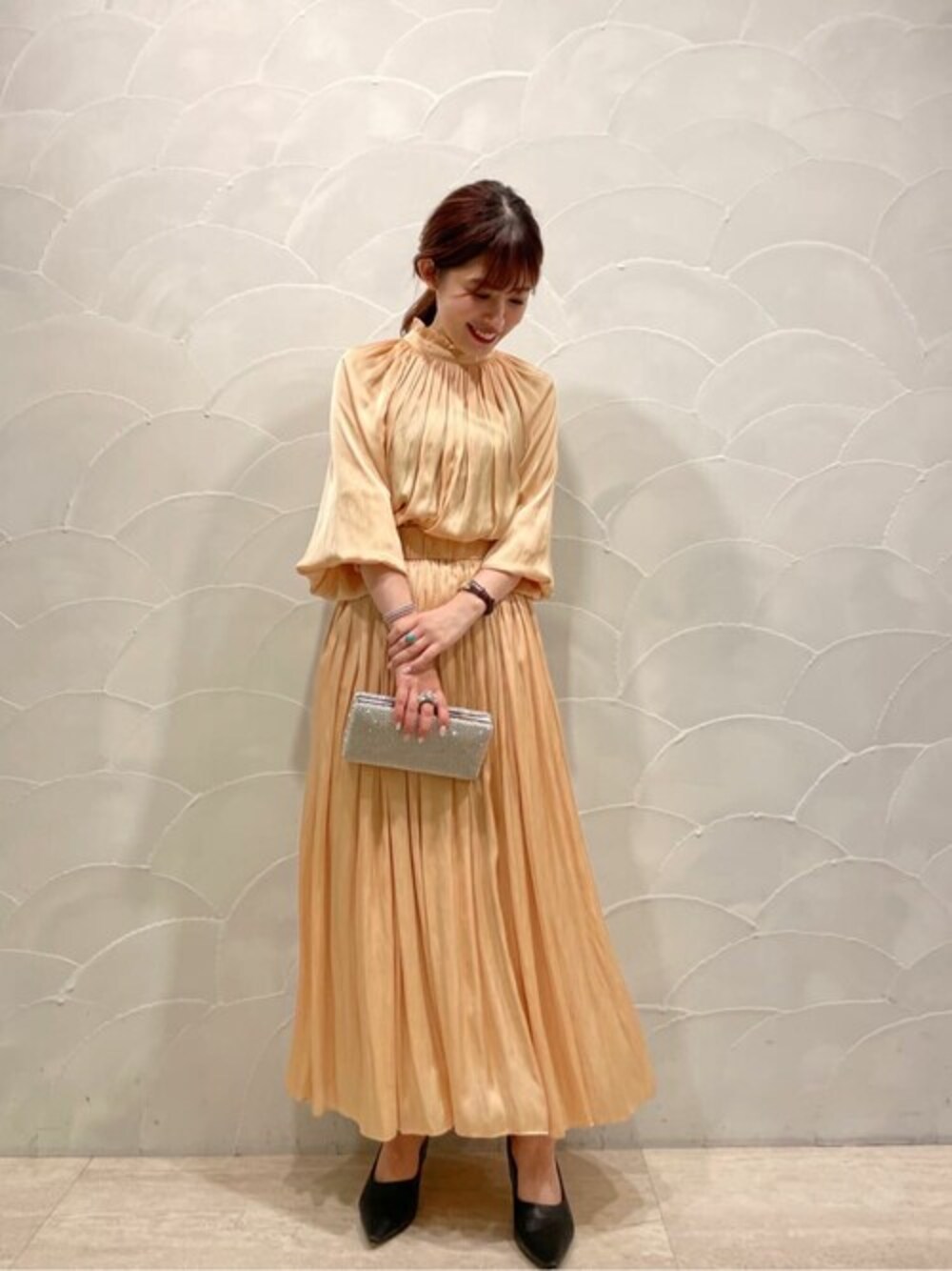 *インスタライブ着用アイテム* *ブラウス* 前後どちらで着られるブラウスです。ボタンを開けて着るとスキッパーのブラウスのようなシルエットになります。 ギャザーがたくさんあり、生地がたっぷりあるので、体のラインを拾いません。 ハイネックも締め付けすぎず、程よい高さです。 お袖はシャーリングのゴムです。 *スカート* 揺れ感がとても綺麗なスカートです。歩く度に女性らしい雰囲気がでます。 こちらもギャザーがたくさんあるので腰回りやお腹のラインを拾いにくいです。 ニット合わせなど普段使いもしやすいアイテムです。 上下セットアップでワンピース風に着用すると結婚式や華やかなシーンでお使いいただけます。