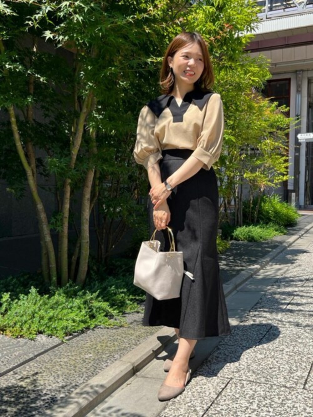 ブラウスの袖口は広めのカフスで、きちんと感を出しつつも涼しさも兼ね備えたデザインです✨ 素材に落ち感があり、女性らしいコーディネートがおすすめです◎