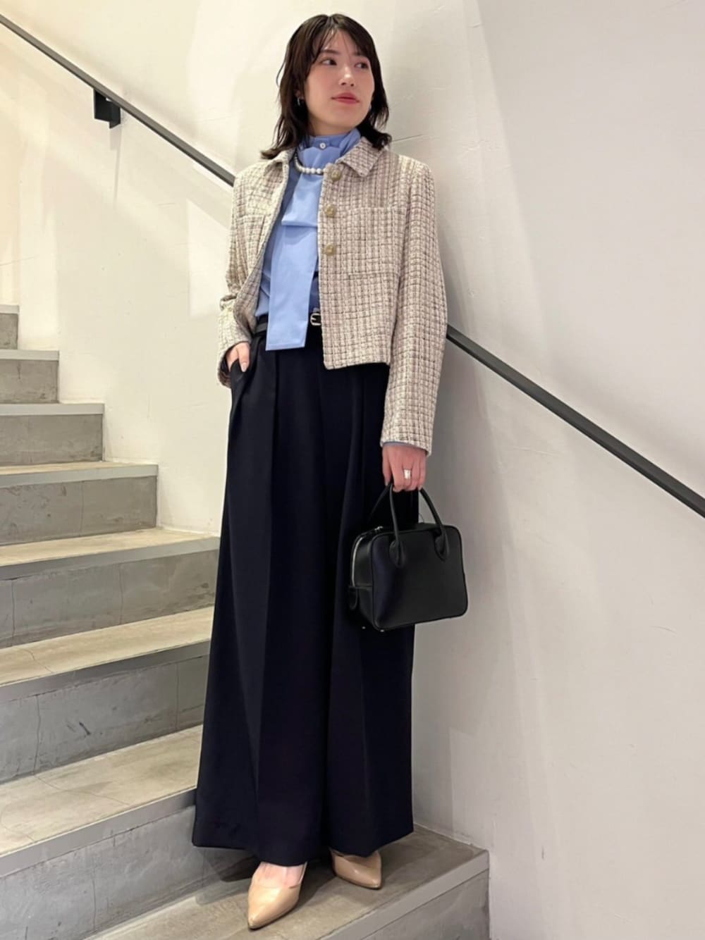 2月の新作アイテムから、 セレモニーシーンにもぴったりなコーディネートをご紹介いたします🌸 イタリア製の生地を使用したミックスツイードジャケットは、アンティーク調の金属釦がクラシカルで、きちんと感のある印象に✨ 合わせたブラウスは、適度なハリと落ち感のあるシャツ素材。 ボウタイは取り外し可能で、連なった貝釦がアクセントになった1着です👔 パンツはシーズンレスでお召しいただけるベーシックなデザイン。 着回し力も高く、同素材のブラウスとセットアップでの着用も可能です!