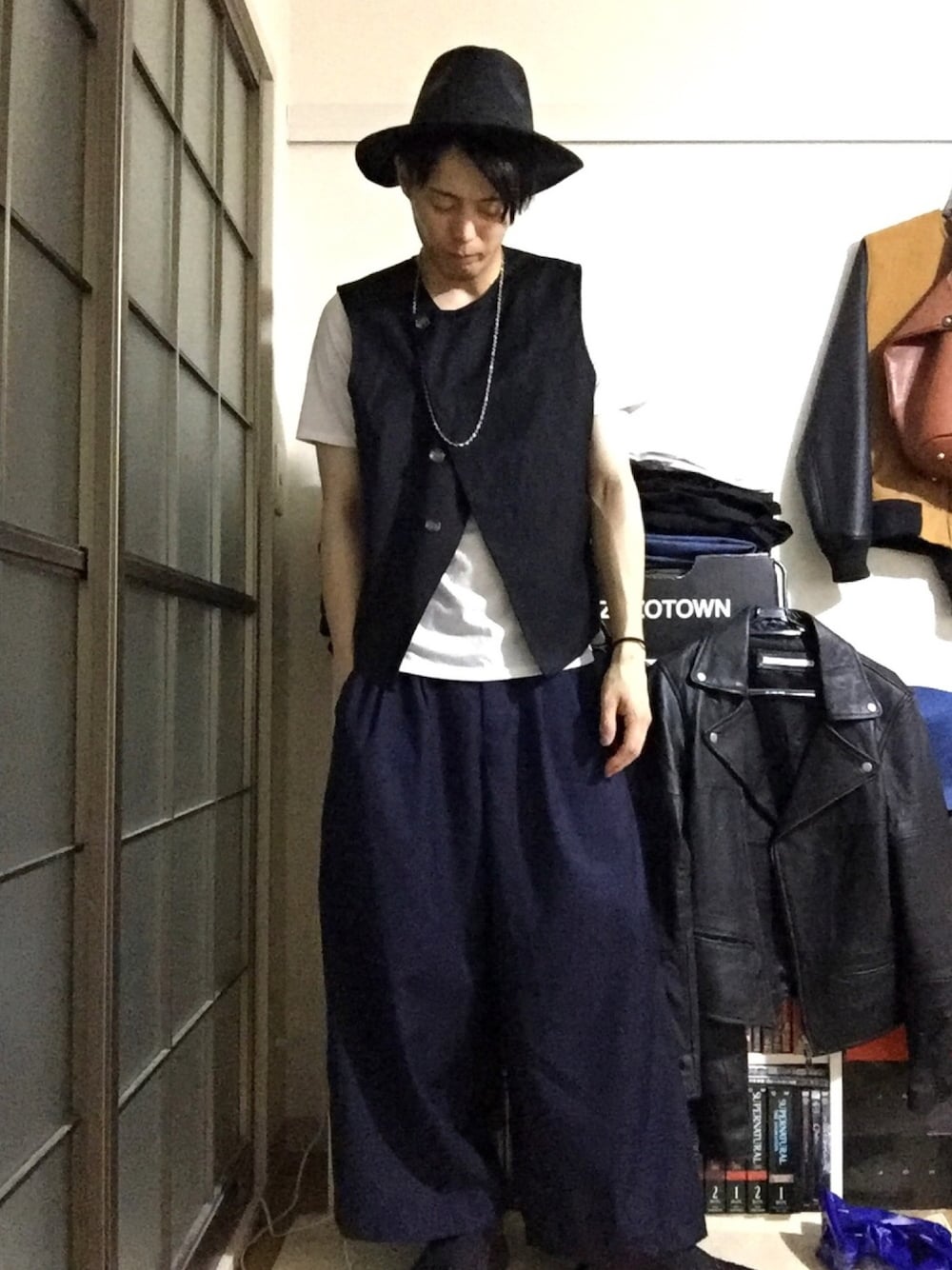 こんばんはー 撮り溜めコーデですー ハット、白Tシャツ、ジレ、ワイドパンツ、ハイカットスニーカーですー 検品祭りで、目がシュパシュパする😓