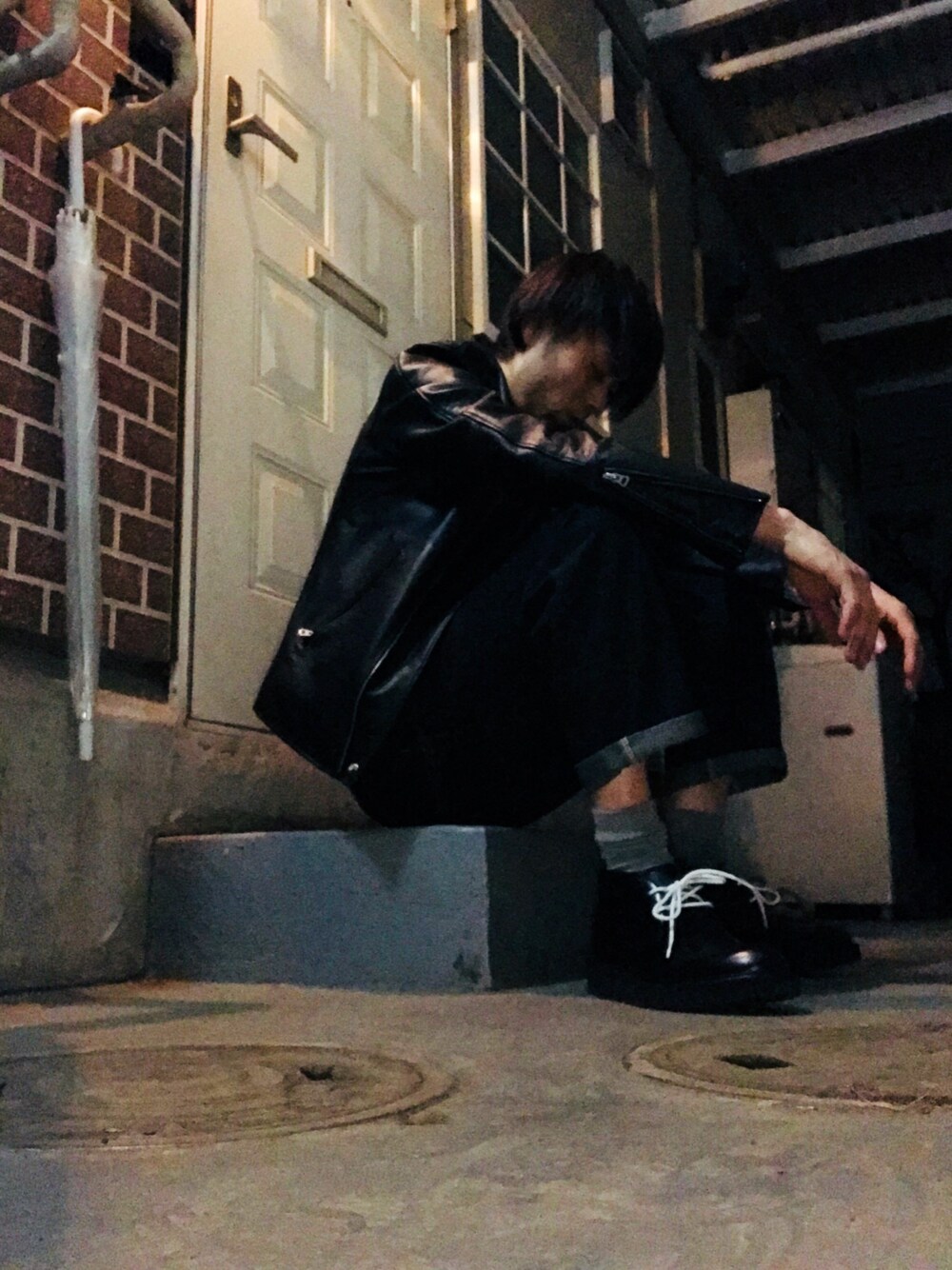 こんばんはー 今日は、ライダース、ロングTシャツ、サルエルデニム、チャッカブーツですねー めずらしく、夜にパシャって見た📸 たまにはいいかも😆👍🏻
