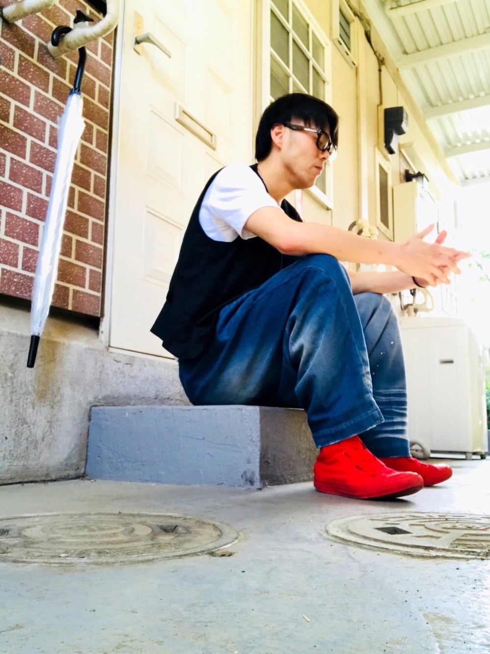 おはようございます☀ 今日は、ダテメガネ、白Tシャツ、ジレ、サルエルデニム、ハイカットスニーカーですねー 今日は、暖かい☀️ こんな日は、きれい目が良いですねー でも、ぐーたらします☺️ でわでわ よいGWを👍🏻