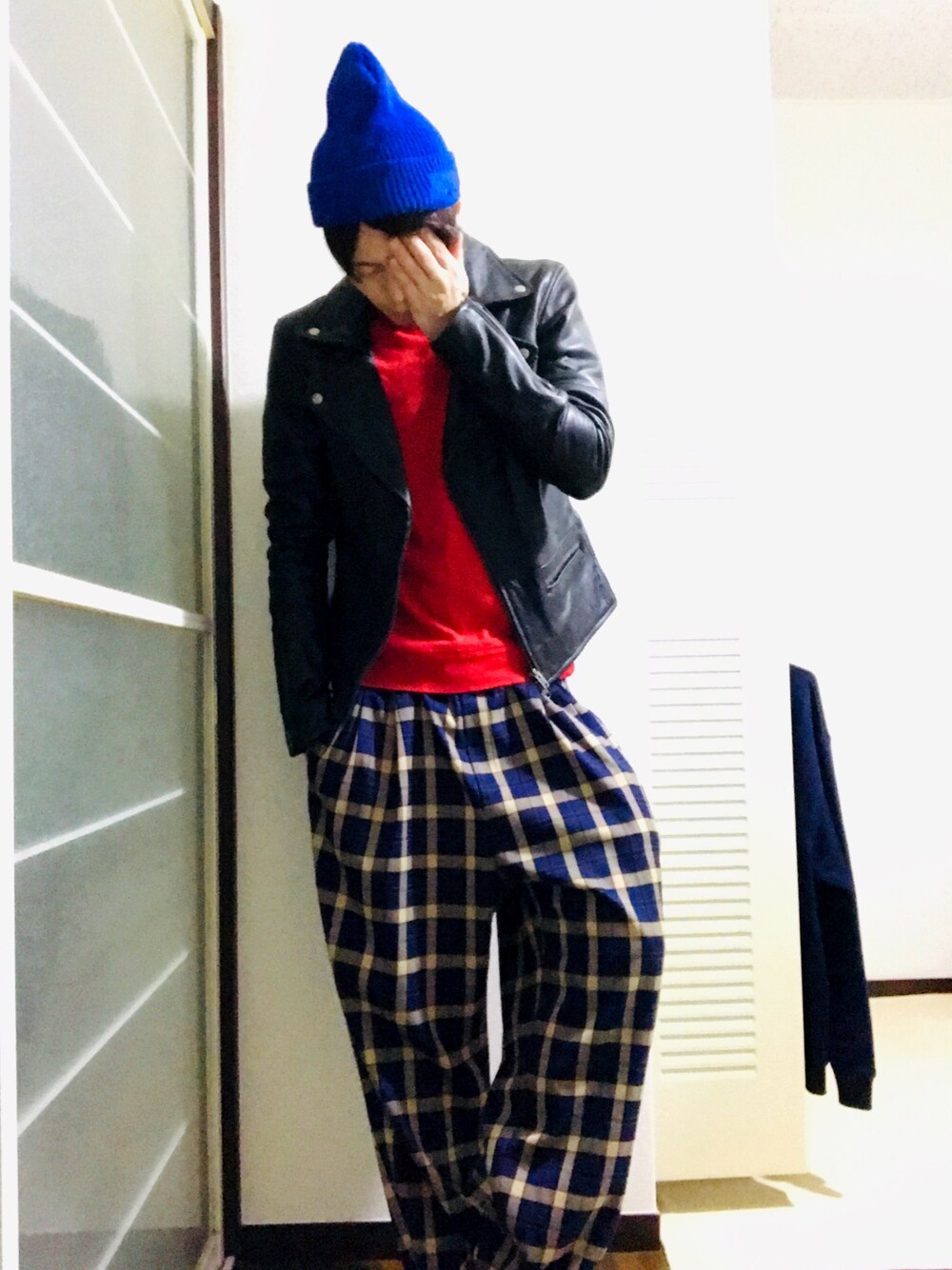 こんばんはー ニット帽、ライダース、赤ニット、チェックパンツですねー このcoenの赤ニット好き☺️ 今年も、赤ニットと白ニット買いに行こうー🚃