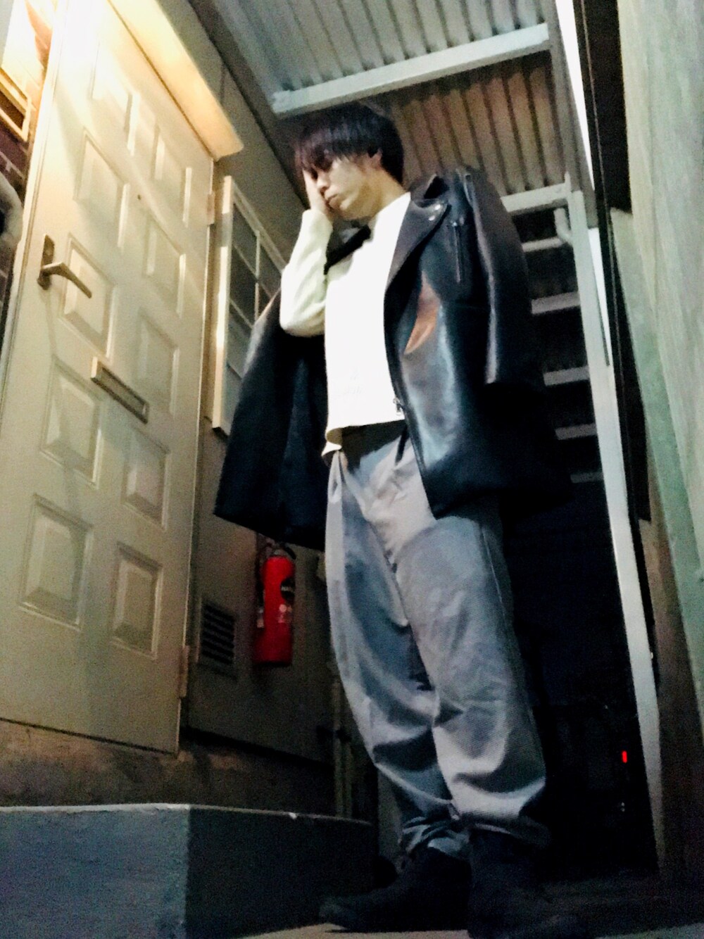 Y-sukeのライダースジャケット「hardcover/Fake Leather Long Riders」を使ったコーディネート