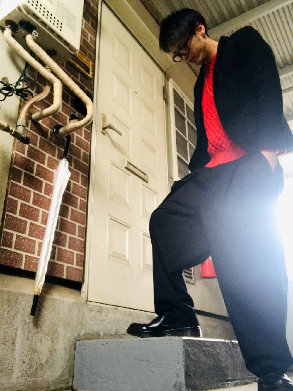 おはようごぜーます🌨 今日は、ダテメガネ、ショートジャケット、赤ニット、プリーツスラックス、レザースリッポンですねー 一応、ヒートテックと、タイツは履いてるから寒くないよー 今日は、雪ですがぷらぷらしてきます🚋🚶♂️ ワイドパンツに、合いそうなスニーカースリッポン探してきます👟