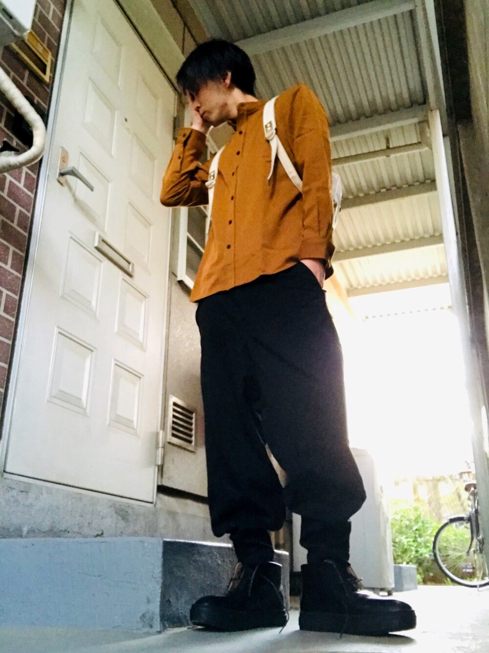 こんばんはー 今日、2回目のコーデですー バンドカラーシャツ、サルエルパンツ、チャッカブーツ、リュックですねー ちょいと、暖かいので腕はまくってます😓 仕事終わったので、着替えてちょいと無印良品まで行ってきますー🚋 新しい、家具が欲しい☺️
