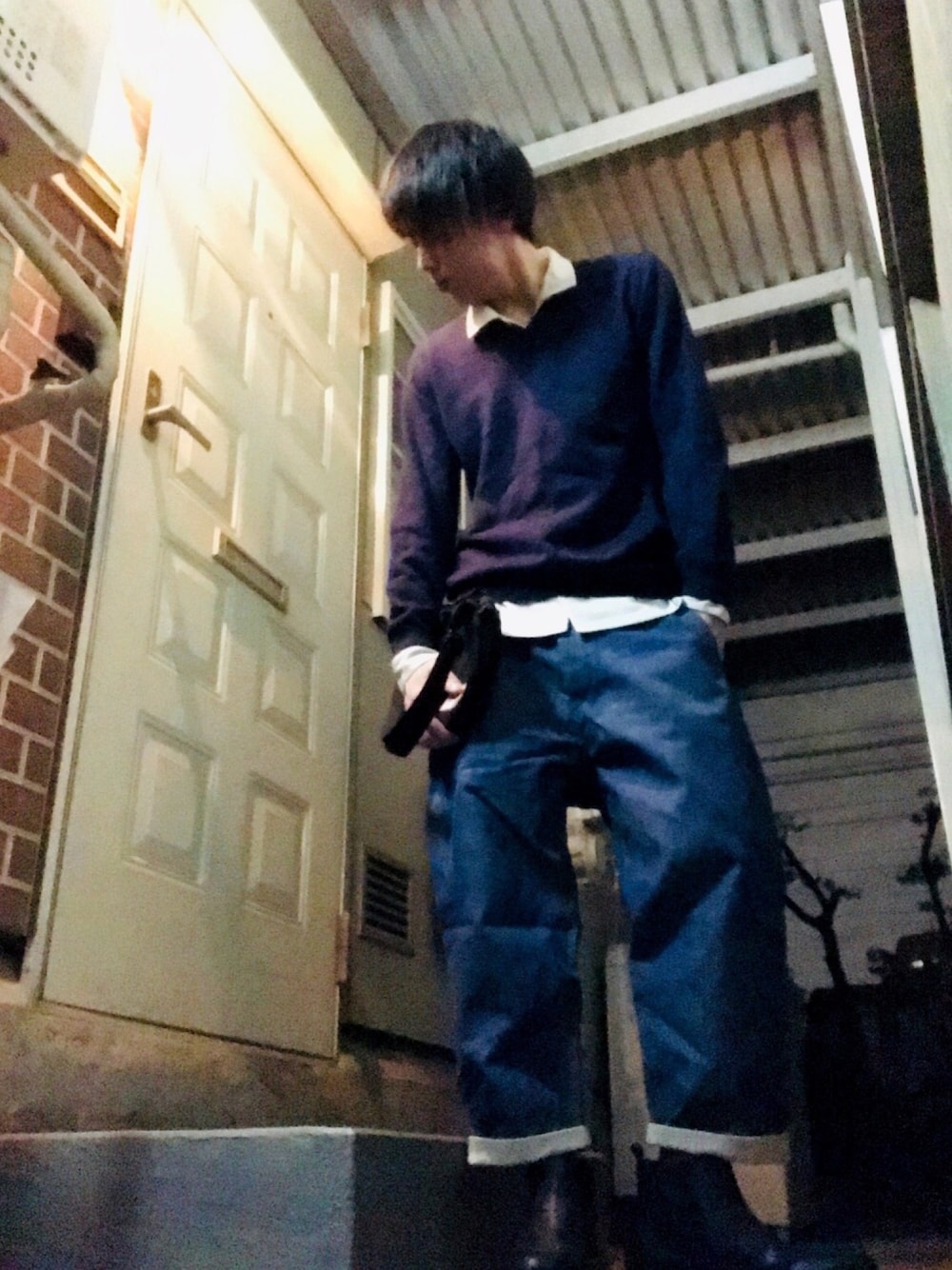 おはようございます🌥 昨日のコーデですー ネイビーニット、オープンカラーシャツ、テーパードデニム、ブーツですねー さいきん、寝るのちょー早い😪