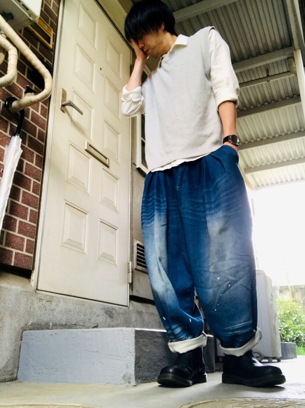 おはようごぜーます😪🌥 今日は、ニットベスト、白シャツ、ワイドデニム、ブーツですねー 今日は、朝からお酒飲みながら「キングダムハーツ」やってます🎮 午後から、ぷらぷらして来まーす🚋