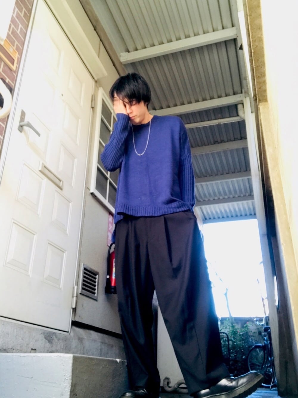 おはようごぜーます🌤 昨日のコーデですねー 青ニット、バルーンパンツ、オックスフォードシューズですねー 昨日は、一日中ぐーたらしてましたー