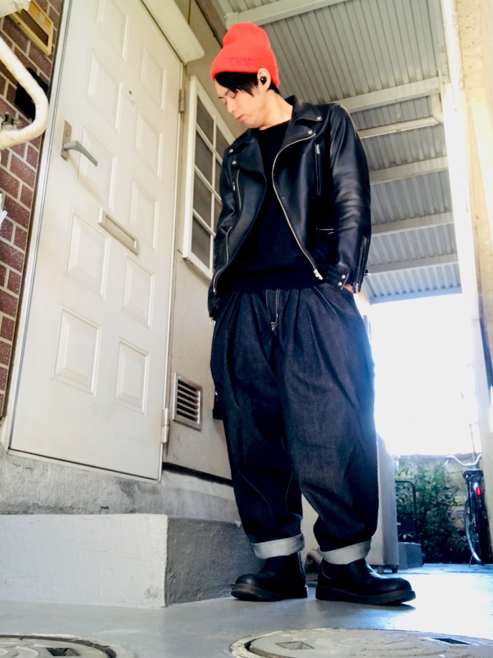 こんにちはー☀️🌬 今日はニット帽、ライダース、黒ニット、ワイドデニム、ブーツですねー 今日は、ぷらぷらしつつスマホのフィルムを買ってきましたー