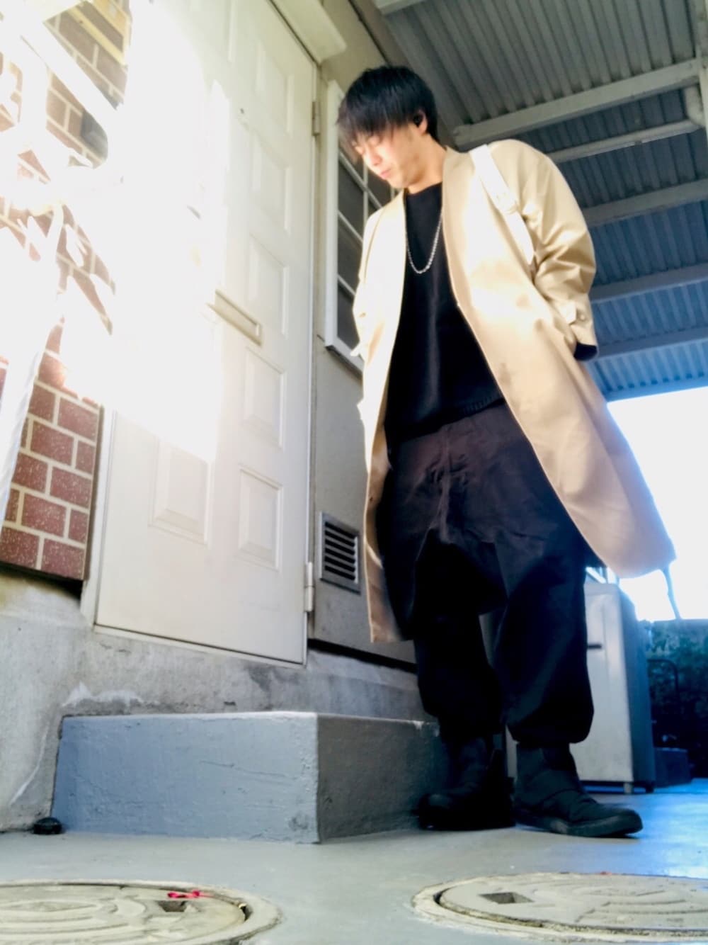 こんにちはー☀️ 今日は、スナップコート、黒ニット、サルエルパンツ、スニーカーですねー 今日も、ぷらぷらしてきましたー
