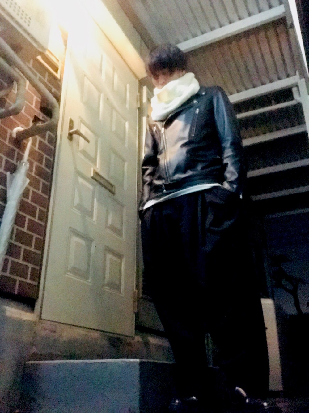 続いて 2日前のコーデですねー ライダース、ロングTシャツ、プリーツスラックス、レザースリッポン、スヌードですねー