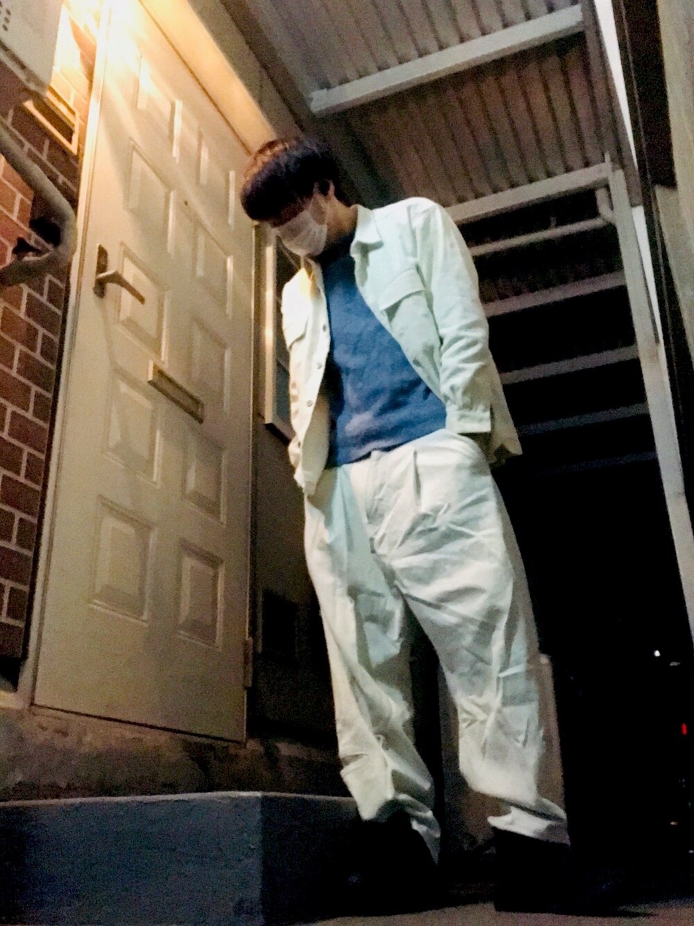こんばんはー 今日は、コーデュロイシャツ、水色ニット、デザインデニム、スニーカーですねー パステルカラーが、ムズイから白と水色みたいな😓