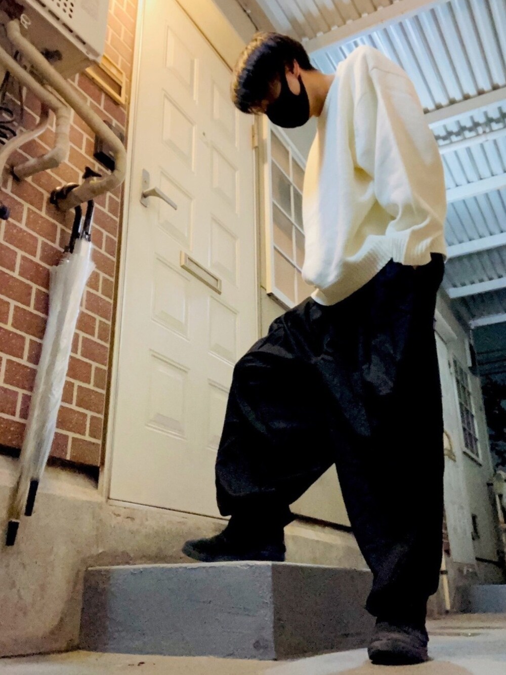 こんばんは🌝☁️ 今日は、白ニット、タックパンツ、スニーカーですねー tai君のブランドの白ニット買ってみた😏 着丈短めで、袖長い感じでレイヤード系にしたら合う感じかも😏