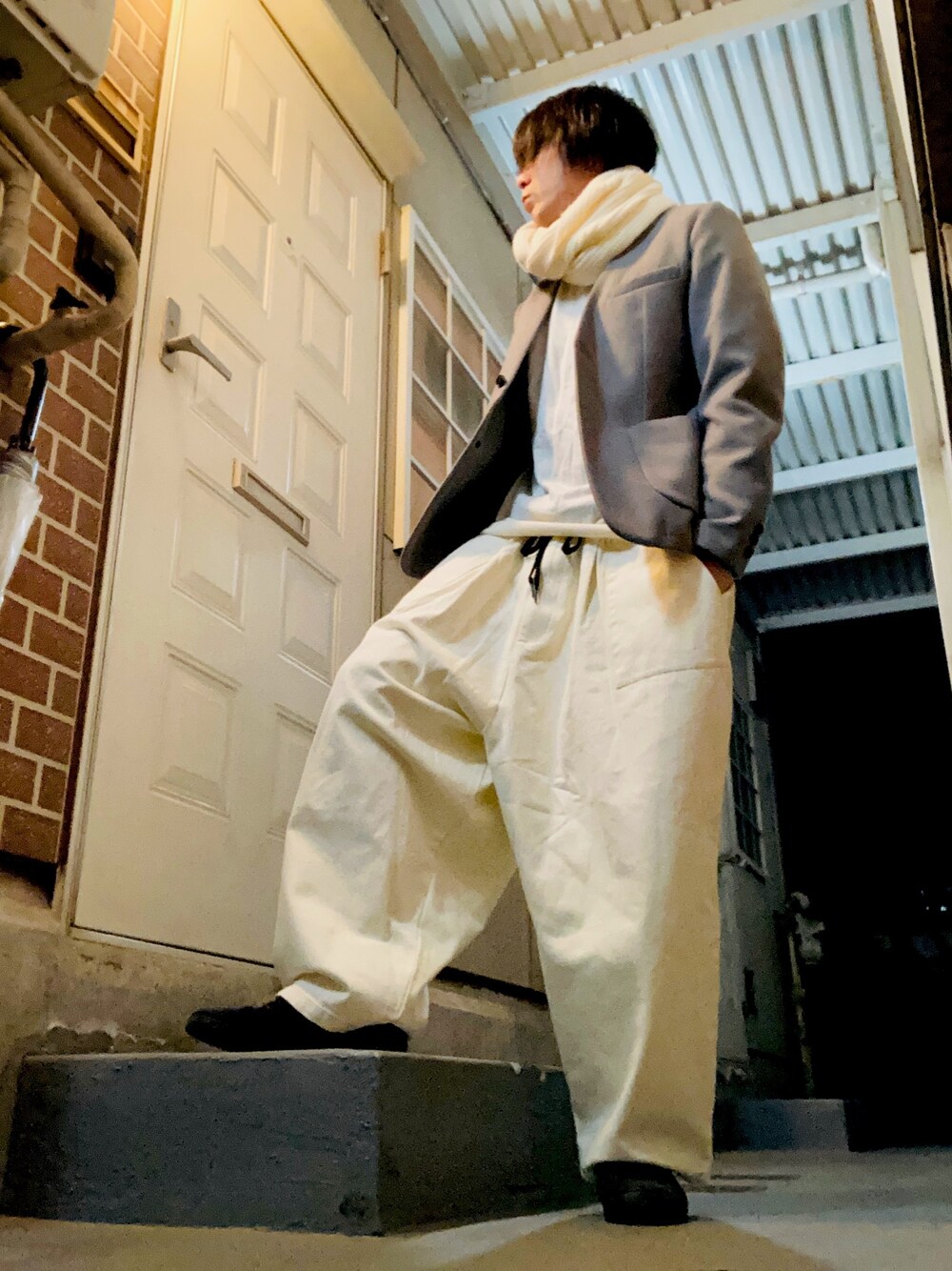 こんばんは🌝 ノーカラージャケット、白ニット、バルーンデニム、スニーカー、スヌードですねー 明日から、仕事… 年末年始休みあっという間に終わった😱