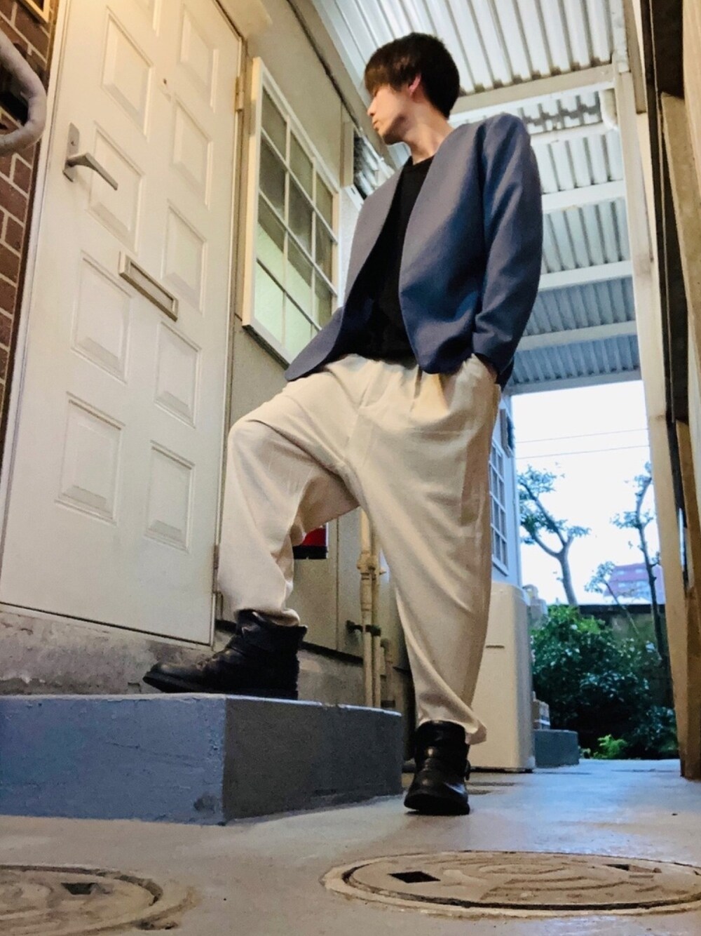 こんばんは☁️ 今日は、ノーカラージャケット、黒ニット、テーパードパンツ、ショートブーツですねー 微妙な天気ですな🥺 最近、週末の天気が悪すぎるんじゃ😒
