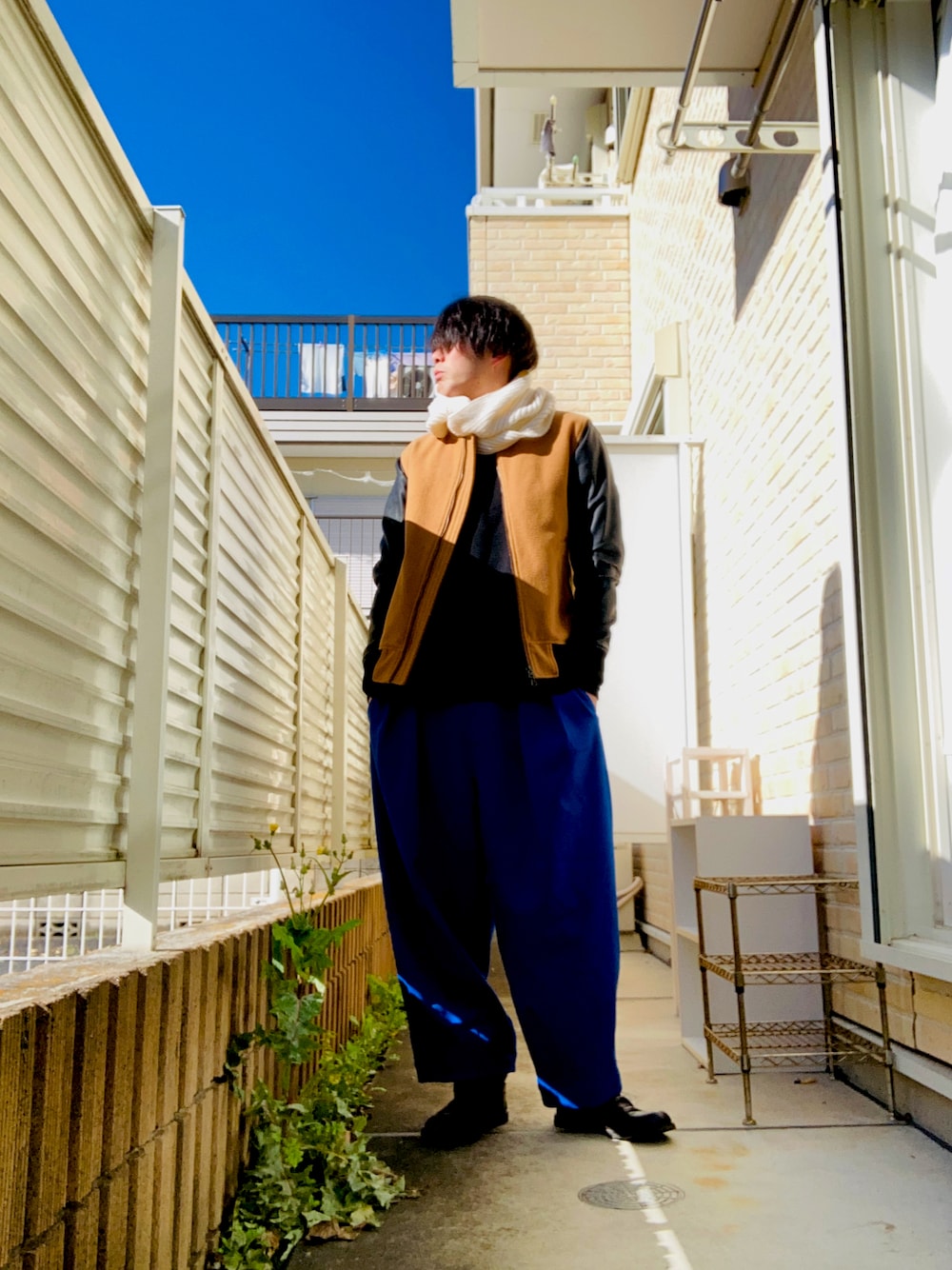 こんにちは🌞 今日は、スタジャン、黒ニット、バルーンパンツ、ブーツ、スヌードですねー あー、ちゃぶい🌬😖