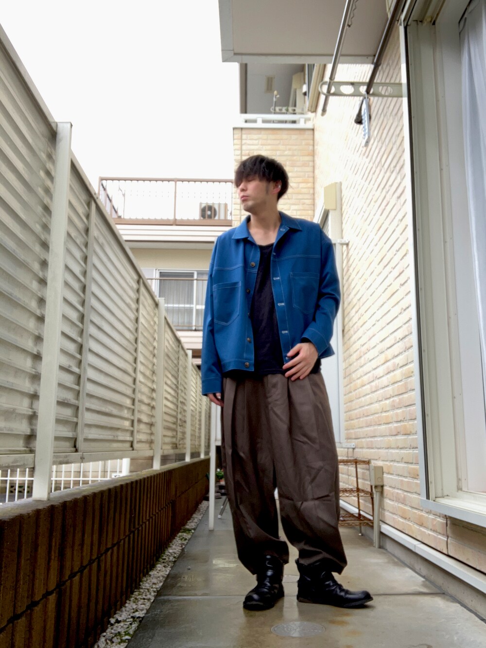 Y-sukeのセットアップ「【BASQUE -enthusiastic design-】T/R ストレッチ オーバーサイズ ステッチ CPOブルゾン カバーオール ベイカーワイドパンツ<セットアップ>」を使ったコーディネート