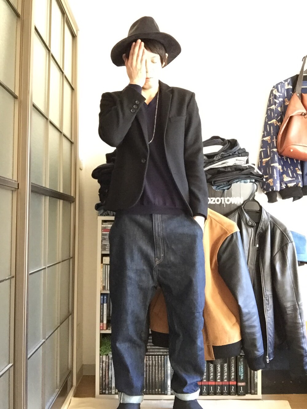 いつぞやのコーデパート2 ハット、ジャケット、ネイビーニット、サルエルデニム、オックスフォードシューズですねー
