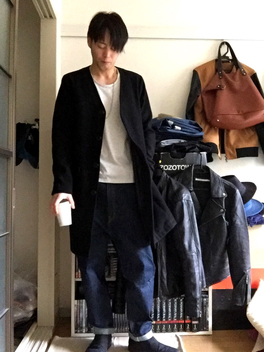 Y-sukeのステンカラーコート「hardcover/ノーカラーMELTON WOOLコート」を使ったコーディネート