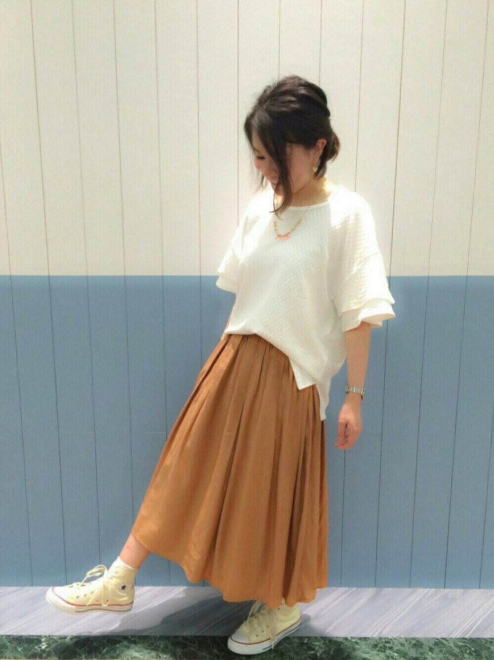 光沢のあるスカートはきれいめでもカジュアルでもあわせられます😊 今日は袖がティアードになったトップスでガーリーに合わせてみました♡ でもガーリーになりすぎないように足元は大好きなスニーカーです🙋✨