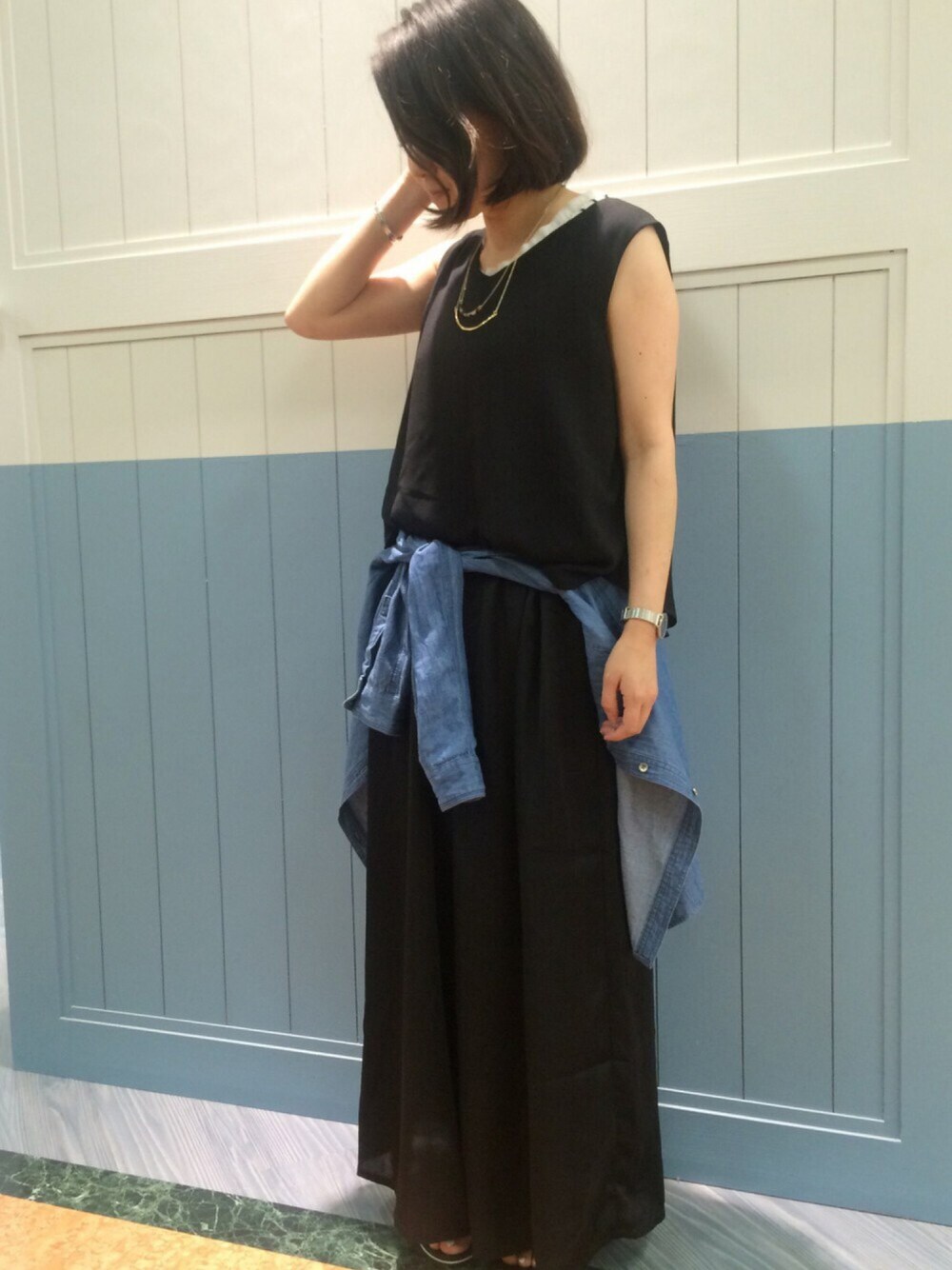 きれいめオールインワン スポサンとデニムシャツ巻きでカジュアルコーデ🏃 パンツはワイドなシルエットで今年っぽくていいかんじです😊✨