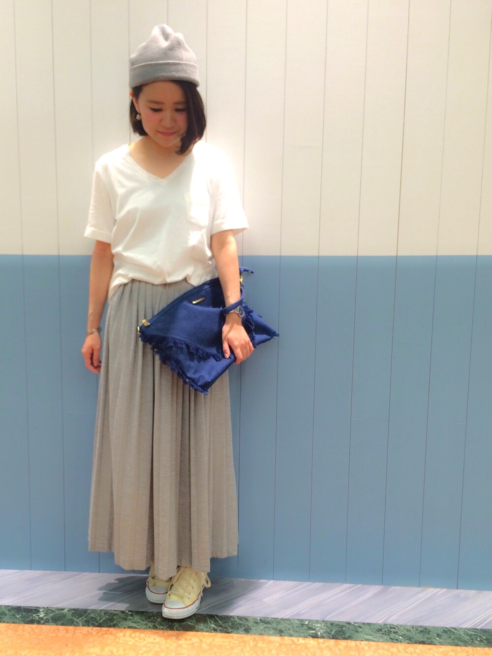 ポケTシンプルコーデ✨ このポケT、袖が最初から折り曲げてあるデザインでかわいい☺️ プチプラなのに生地もしっかりしててすごく着やすいです🙆🎵