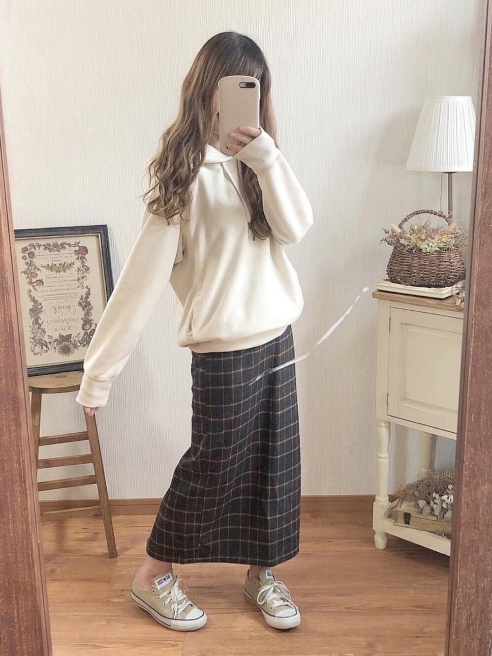 UNIQLOパーカー着回しが続き申し訳ないです 😱笑 ホワイト×ネイビー×ベージュの色味の組み合わせって 大人って感じで好きなんですが!🥺✨ お腹大きくなってきたら履けないくなるから 今のうちタイトスカート履いときます 😤💕 Instagram→@m.fu__u