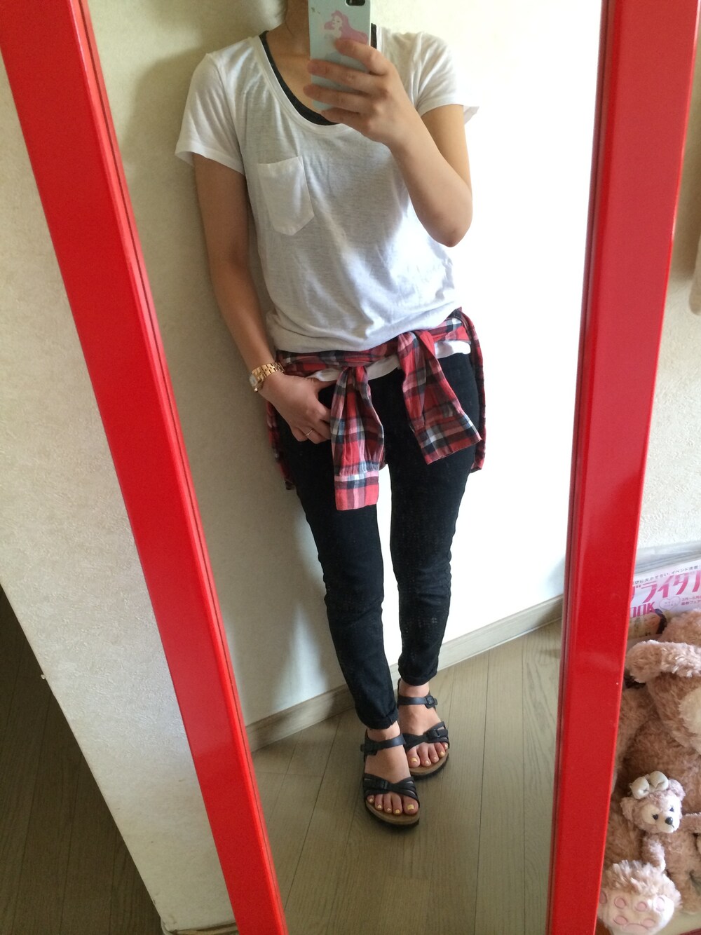 Tシャツ UNIQLO パンツ LOWRYS FARM チェックシャツ UNIQLO シューズ ビルケンシュトック 腕時計 DIESEL