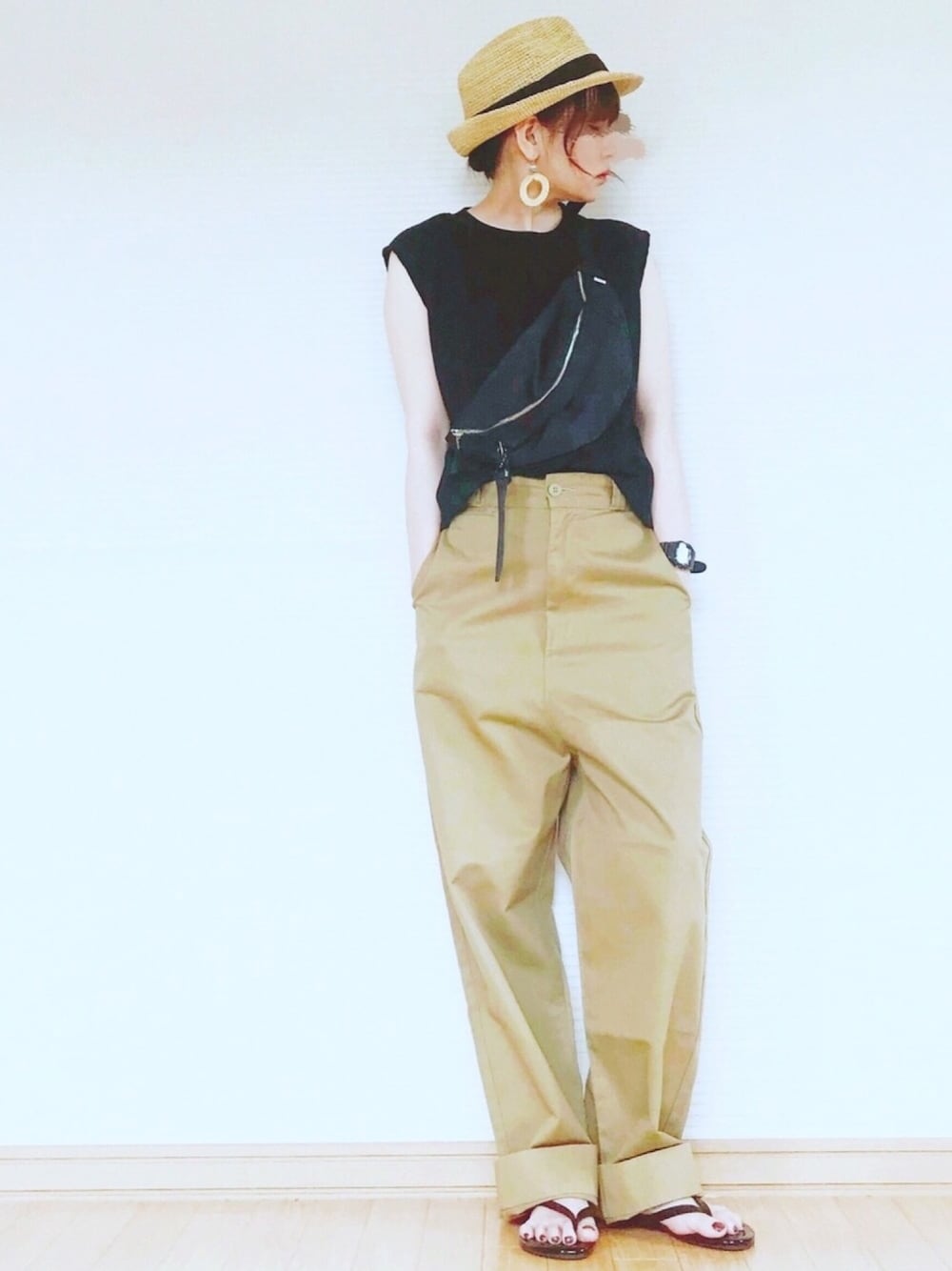 黒ノースリーブとゆるチノパンツの メンズライクコーデです😊 ビームスボーイのチノパンツが良い感じ🤤💕 ゆるさ具合が気に入りました〜👌😊 お安く買えて良かっぱ❣️☺️