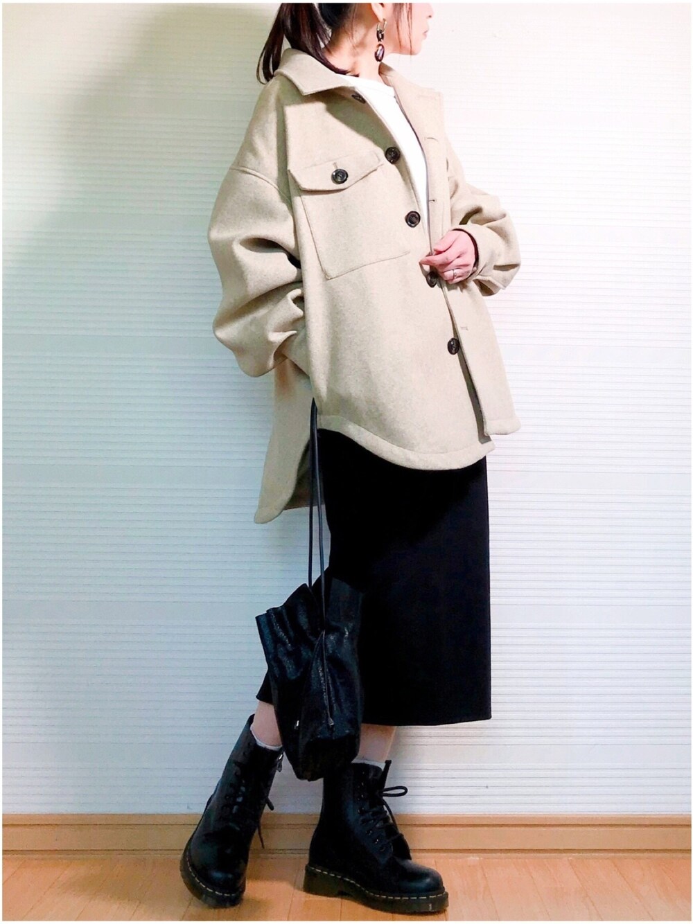 🔶コーデ詳細🔶 *outer.…notch. CPOジャケット 。 *tops.…JEANASIS ペア2P カットソーのみ。 *bottoms.…GU カットソータイトスカート。 *shoes.…chaco closet Dr.Martens / ドクターマーチン 1460 8-EYE BOOT 8ホール ギブソン ブーツ。 *bag.… TDB 内袋付き巾着タイプのレザーバッグ。 *accessory….GOLDY スクエアフープ ドロッピングイヤリング 。 *wristwatch….。