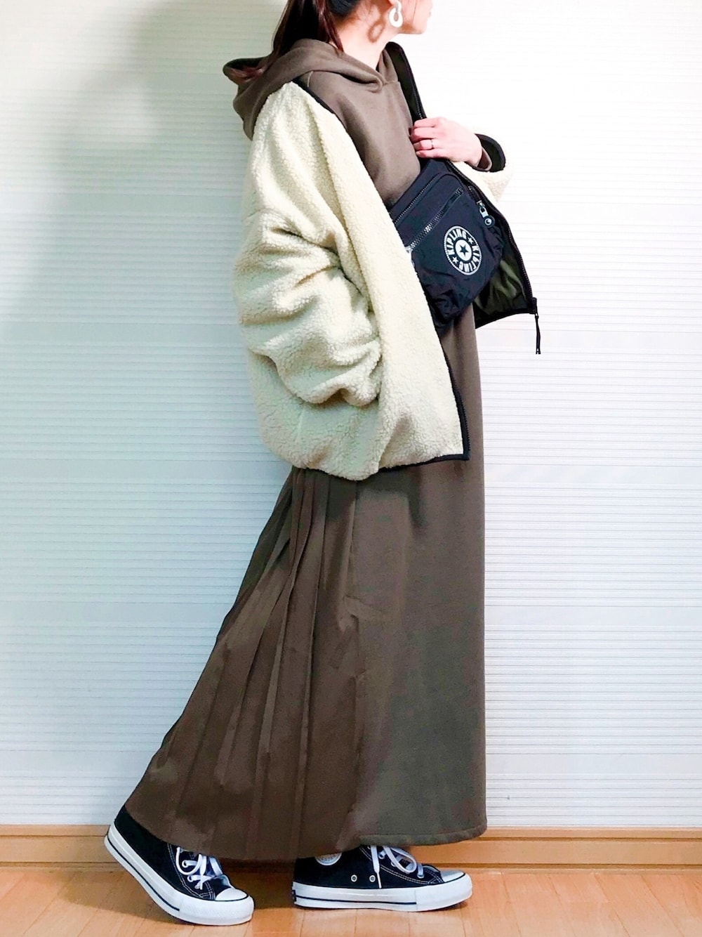 ボアジャケットと Aunt Marie'sさんの裏起毛バックプリーツフーディーワンピース、kiplingさんのギャビーエスでコーデしました😊 本日Aunt Marie'sさんZOZOTOWNにて 1000円クーポン出ております🤗❤️ それでは今日もよろしくお願いします😊🙏💕 🔶コーデ詳細🔶 *outer.…chaco closet リバーシブルボアフリースジャケット。 *tops.…AUNT MARIE'S 裏起毛バックプリーツフーディーワンピース。 *shoes…. CONVERSE ALL STAR 100 COLORS HI。 *bag.…kipling ギャビー エス(ライブリーブラック)。 *accessory….GOLDY ニュアンス シェイプ ダブル リング イヤリング。 *wristwatch….。 #PR