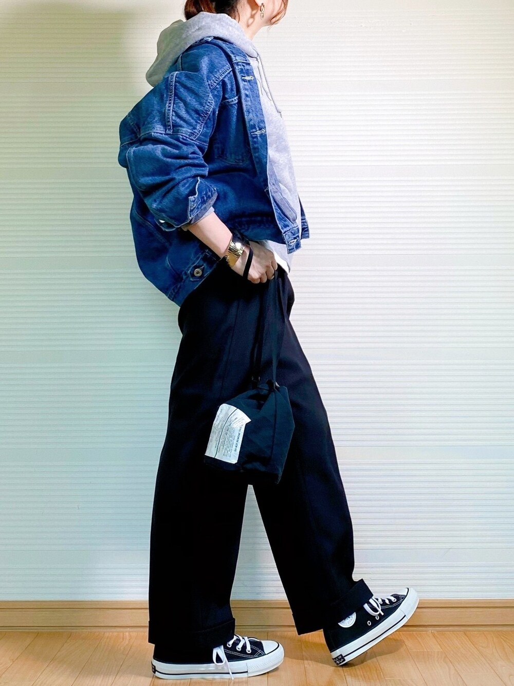 Leeのトラウザーパンツ、 形も綺麗で生地も厚手でお気に入り💕 本日はデニムジャケットで合わせてみました。 🔶コーデ詳細🔶 *outer.…antiqua BIGデニムGジャン。 *tops.…ZOZO 裏毛プルオーバーパーカー(パターンオーダー)/グレー【WOMEN】。 *bottoms.…Lee 【着回し力抜群のきれいめパンツ】タック入り トラウザーパンツ。 *shoes.…CONVERSE ALL STAR 100 COLORS HI。 *bag.…WEB限定 BURLAP OUTFITTER/バーラップアウトフィッター 別注 X-PAC パーソナルエフェクトショルダーバッグ。 *accessory….❶GOLDY フラット チェーン イヤリング。 ❷ *petitcro*ボリュームバングル。