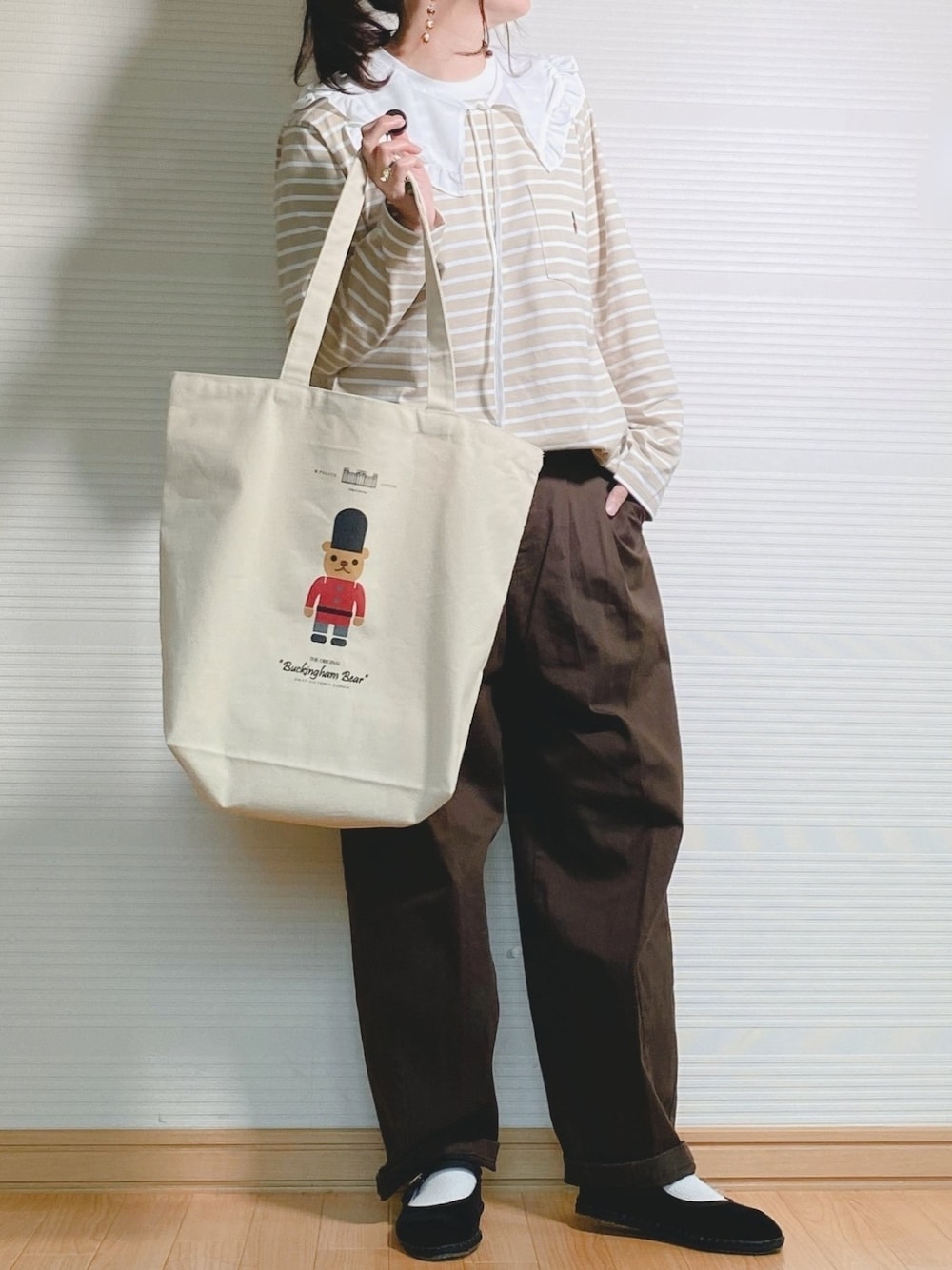 🔶コーデ詳細🔶 *tops.…❶ MACKINTOSH PHILOSOPHY 【BUCKINGHAM BEAR】クルーネックロングスリーブ。 ❷apart by lowrys フリルリボンツケエリ 932253。 *bottoms.…devirock ヒザデルパンツ。 *shoes.…<DROGHERIA CRIVELLINI>MARYJANE フラットシューズ。 *bag.…MACKINTOSH PHILOSOPHY 【BUCKINGHAM BEAR】バッキンガムベア トートバック 。 *accessory….GOLDY トータシェル シルバー 2WAY ピアス。
