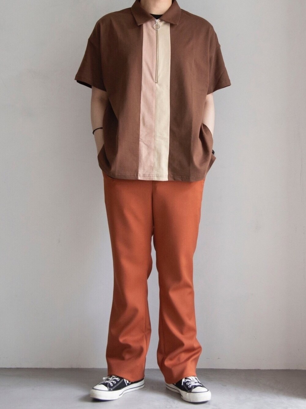 ビッグなハーフジップTには 同系色のシューカットスラックスでクラシックブラウンな装いに 赤レンガ倉庫擬人化スタイル