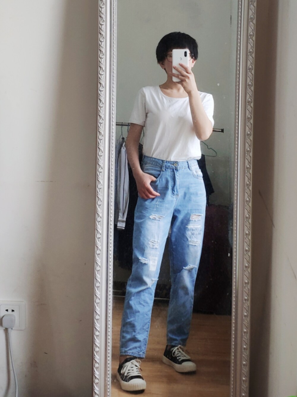 全身淘宝货。28元的T恤,58的牛仔裤,25的帆布鞋。