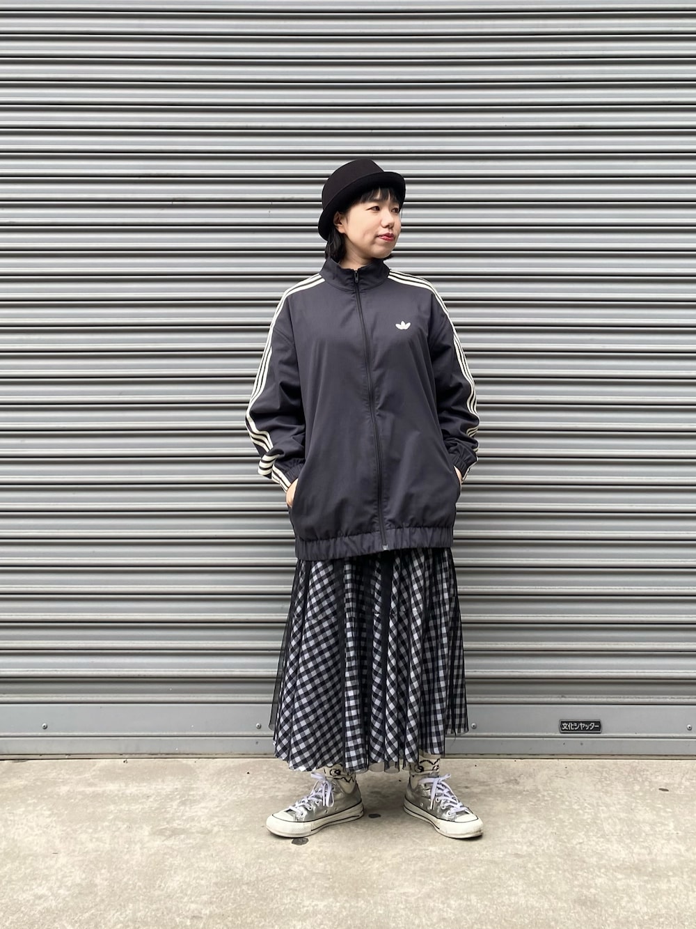黒っぽいコーディネートも シアースカートとギンガムチェックで春らしくしてみました☘️
