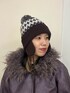 ぽんぽんつきニット 着用カラーはブラウン🟤 紫のアウターに合わせてみました♪ 柄が程よくて大人の方でも遊びをいれてコーディネートしやすい帽子です!