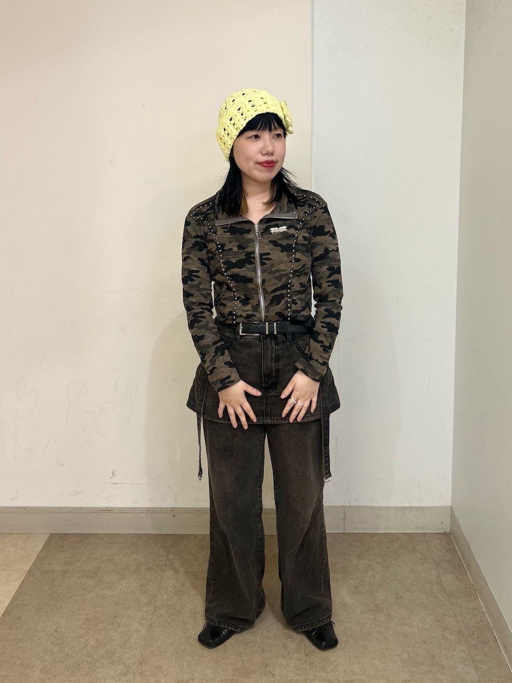 迷彩のトップスにあえてレース編みに花柄のニット帽子を合わせました! 黄色はいろんな色の中間に使いやすいので今年の春イエローに挑戦したいです🟡🟡🟡