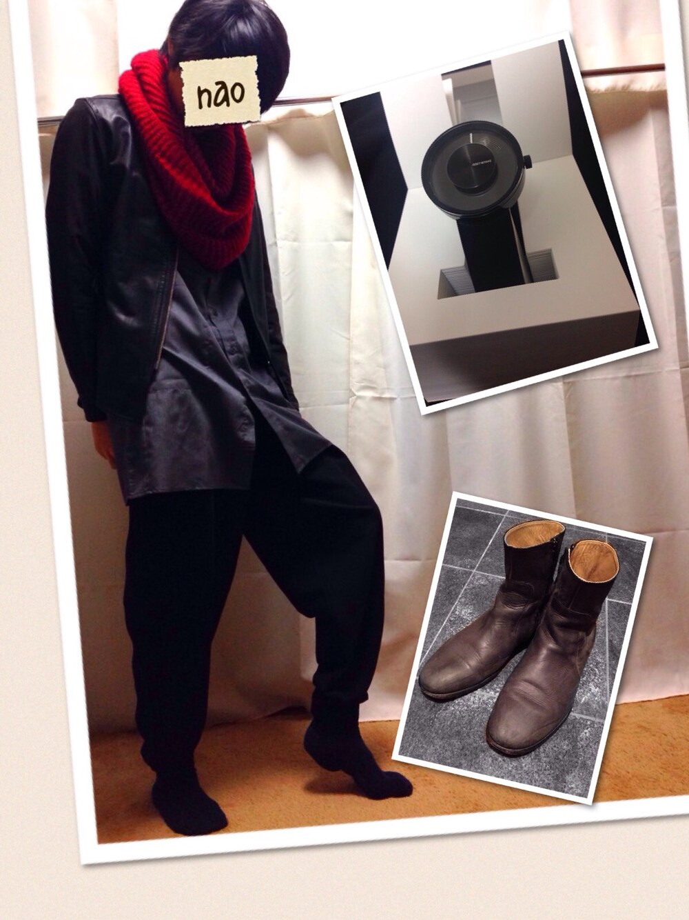オールブラックコーデです! オールブラックコーデなのに、血迷って赤をいれてしまいました。 ワイドでゆったりしたシルエットです。 ヘルムートラングのワイドパンツはすごいです。 ハレの2014SSのロングシャツもモードな感じでいい感じです。 レザーは昨日とはちょっと変えてstudiousのにしてみました。靴はマルジェラ、時計はイッセイのVueです。 今日は晴れるといいなぁ…