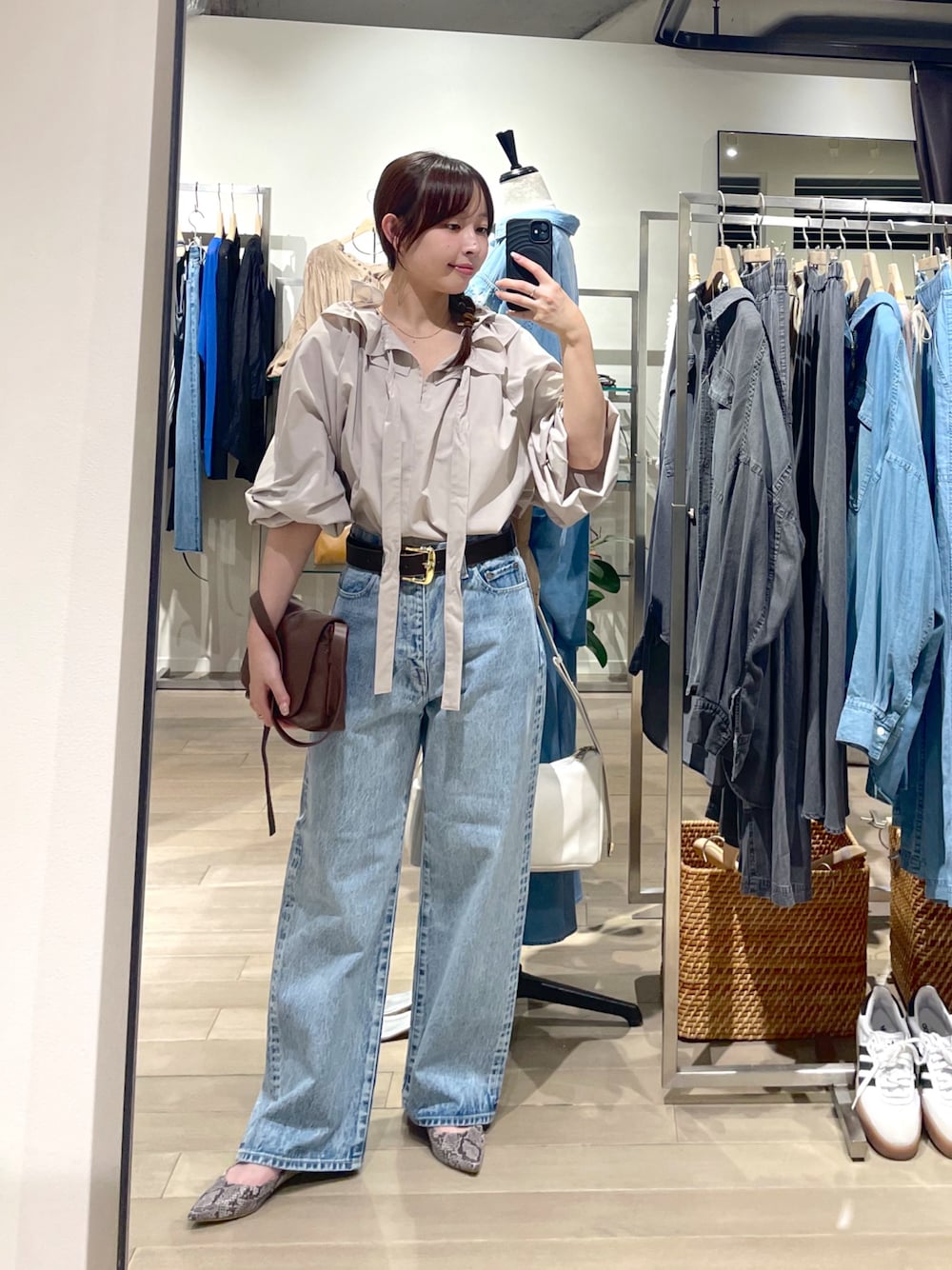 ドロストフリルカラーブラウス×OKAYAMAベーシックデニムの綺麗めカジュアルコーデ 大人気のOKAYAMAデニムに 新色のサックスブルーが登場!
