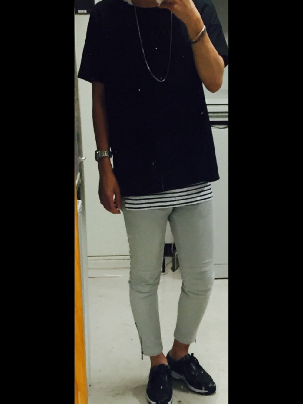 写真がデカすぎて顔が見切れましたー🙏 最近ずっとテバ履いてましたが、 涼しくなってきたので久しぶりに バニスターのチロリアンスニーカー履きました これはwearでお気に入りの人が履いていて一目惚れしたやつです✌🏻 ソールがビブラムソールで革靴とスニーカーのいいとこ取りって感じです。 全体的に 白黒+ボーダーでシンプルに…