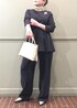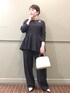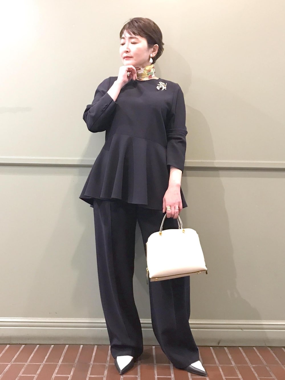 ワイド目のパンツにペプラムブラウスをスタイリングしてみました。 パンツに丈感や長さが出ると、華やかな印象になります♪ 低身長ですが、ペプラムのくびれでバランスが取れるセットアップでしたので GGS24000とはまた違うバランスになります。