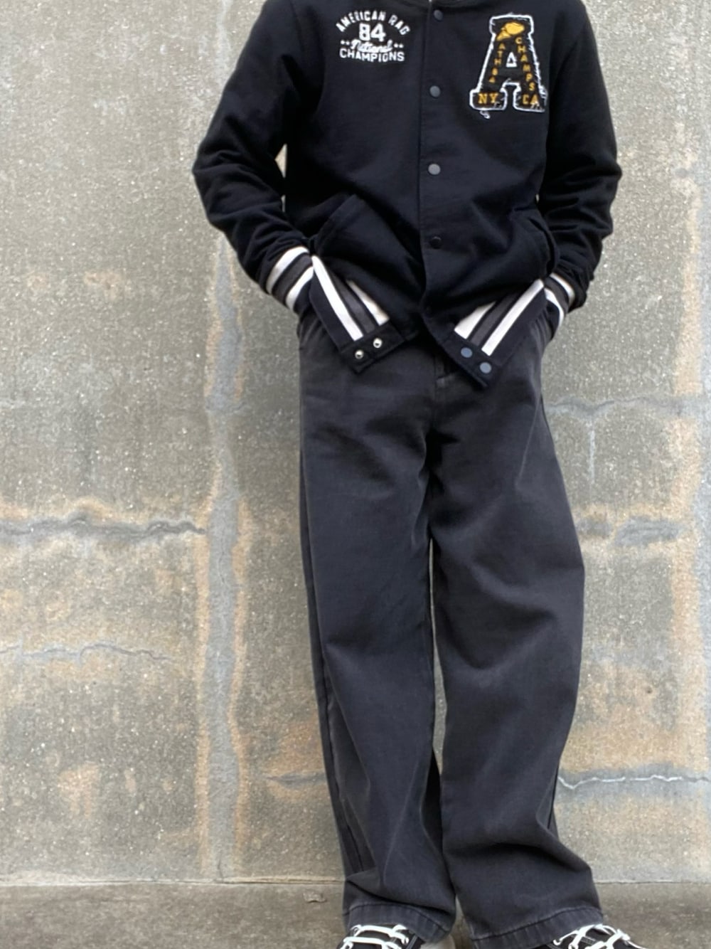 今日はアメリカンなコーデに仕上げました🇺🇸 Championの古着のスタジャンにお気に入りのインターファクトリーのデニムパンツを合わせて、アメリカンと言ったらCONVERSE★ 普通のハイカットシューズでもいいのですが、気分的に厚底!! 色の統一感も完璧💯💮